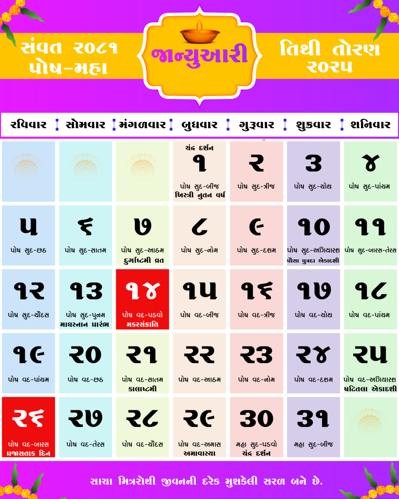 | 14-January–2025 | મંગળવાર | પોષ વદ પડવો | મકરસંક્રાતિ, લોહરી, બેન્ક |