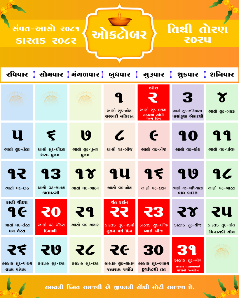 ઓક્ટોબર-૨૦૨૫ ના તહેવારો અને મહત્વના દિવસો | October-2025 Gujarati Calendar