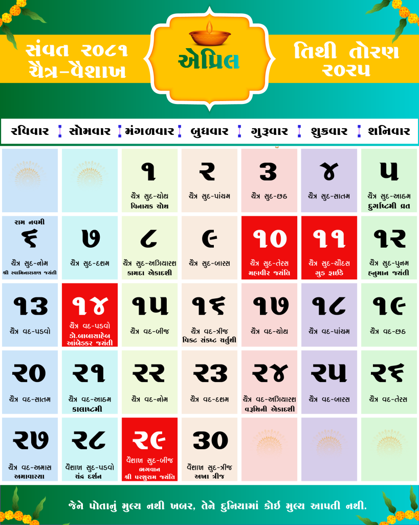 એપ્રિલ-૨૦૨૫ ના તહેવારો અને મહત્વના દિવસો | April-2025 Gujarati Calendar