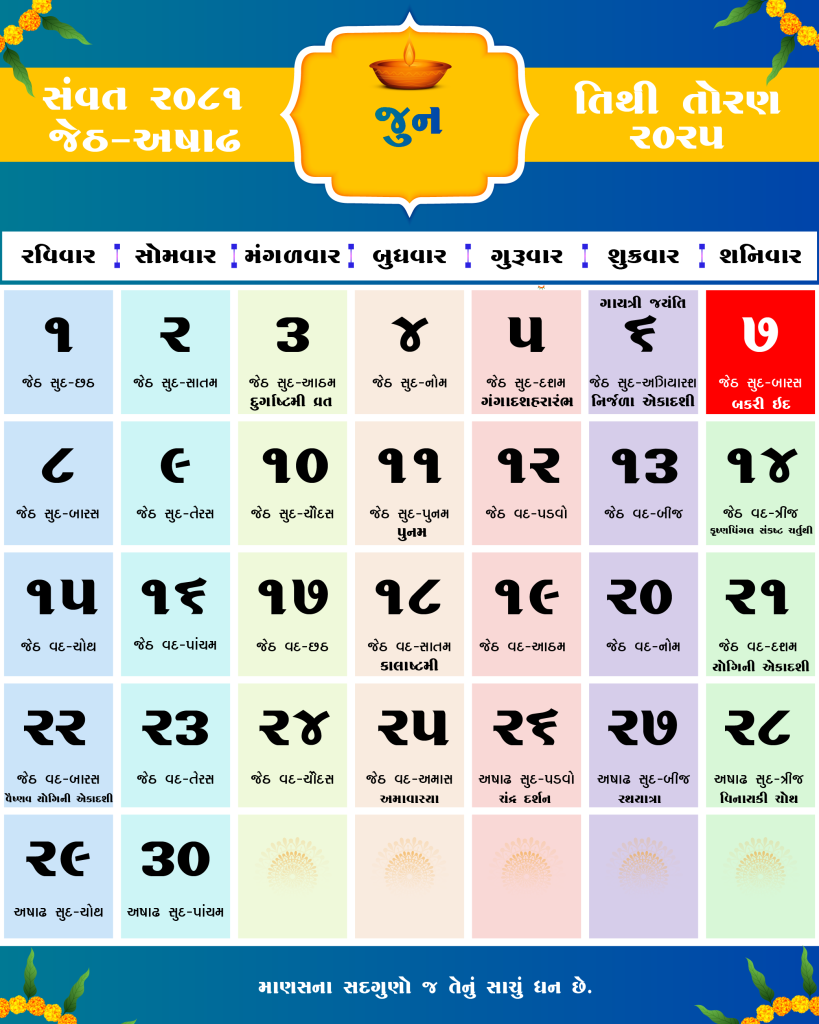 | 6-July-2025 | રવિવાર | જેઠ વદ અગિયારશ | ગૌરી વ્રત પ્રારંભ, દેવશયની એકાદશી, મહોરમ (આસુરા) |