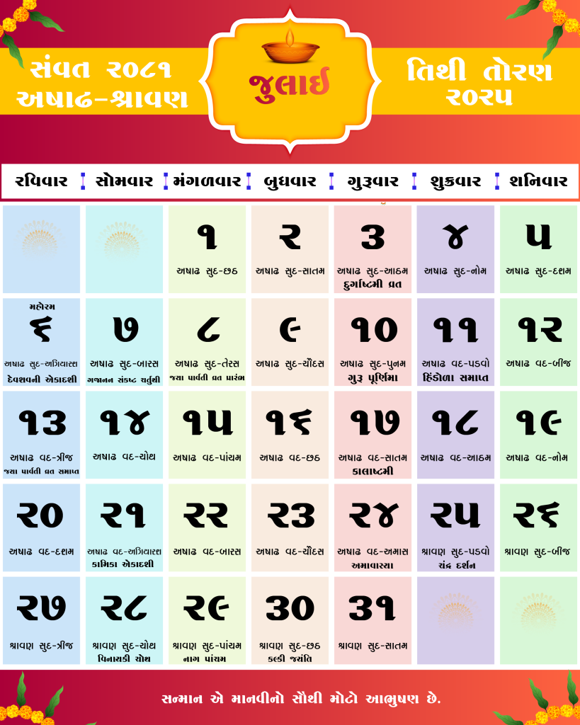 જુલાઈ-૨૦૨૫ ના તહેવારો અને મહત્વના દિવસો | July-2025 Gujarati Calendar